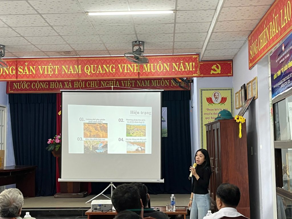 Trong phần hướng dẫn kỹ thuật, ThS. Vũ Thùy Dương – báo cáo viên đã trình bày chi tiết quy trình ủ theo từng bước: làm sạch tạp chất, cắt nhỏ phế phụ phẩm, xử lý vôi, pha dung dịch vi sinh với rỉ đường và các dưỡng chất cần thiết, cuối cùng là tạo lớp ủ để duy trì độ ẩm thích hợp. Báo cáo viên nhấn mạnh việc tuân thủ đúng kỹ thuật sẽ giúp khối ủ đạt hiệu quả cao, hạn chế thất thoát dinh dưỡng và rút ngắn thời gian hoai mục.