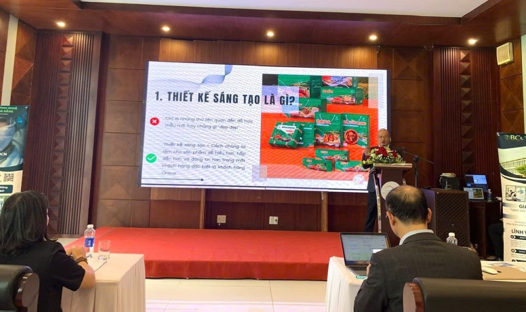 Hướng đến việc nâng cao chất lượng và hình ảnh của các sản phẩm OCOP, ông Trần Quang Vũ – Giám đốc Công ty Quà tặng Quang Vũ – đã có những chia sẻ về thiết kế sáng tạo trong bối cảnh chuyển đổi số. Ông cho biết 80% quyết định mua hàng trên môi trường online diễn ra thông qua hình ảnh, vì vậy thiết kế bao bì và thiết kế số trở thành yếu tố cốt lõi trong việc tạo niềm tin và sự khác biệt cho sản phẩm. Ông Vũ nhấn mạnh rằng để thiết kế bao bì phát huy hiệu quả, sản phẩm cần được thể hiện theo phong cách đặc trưng và mang hơi hướng bản địa, giúp khách hàng dễ dàng nhận diện câu chuyện, nguồn gốc và giá trị văn hóa của từng sản phẩm OCOP.